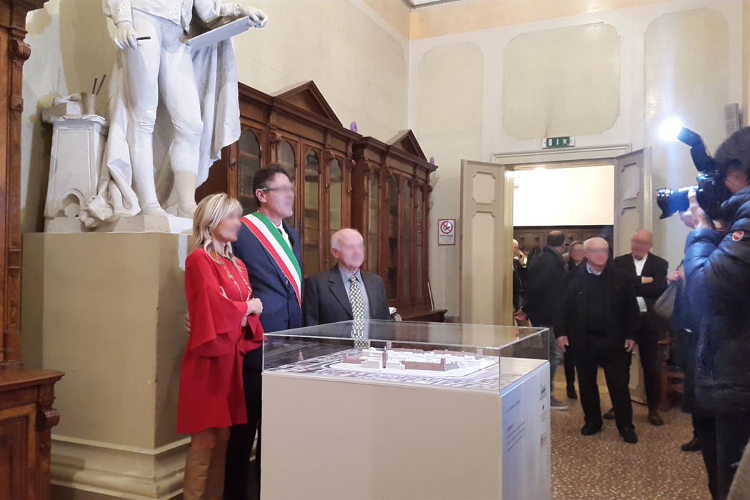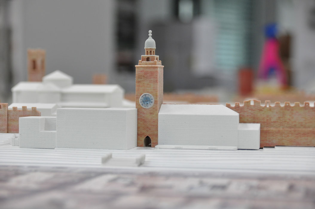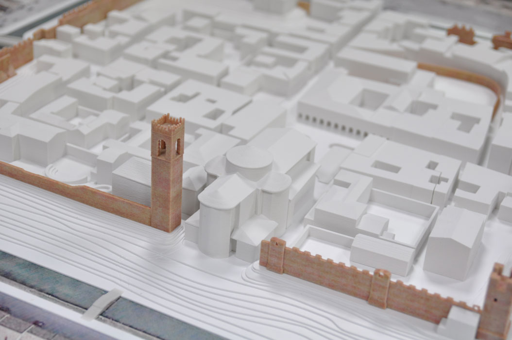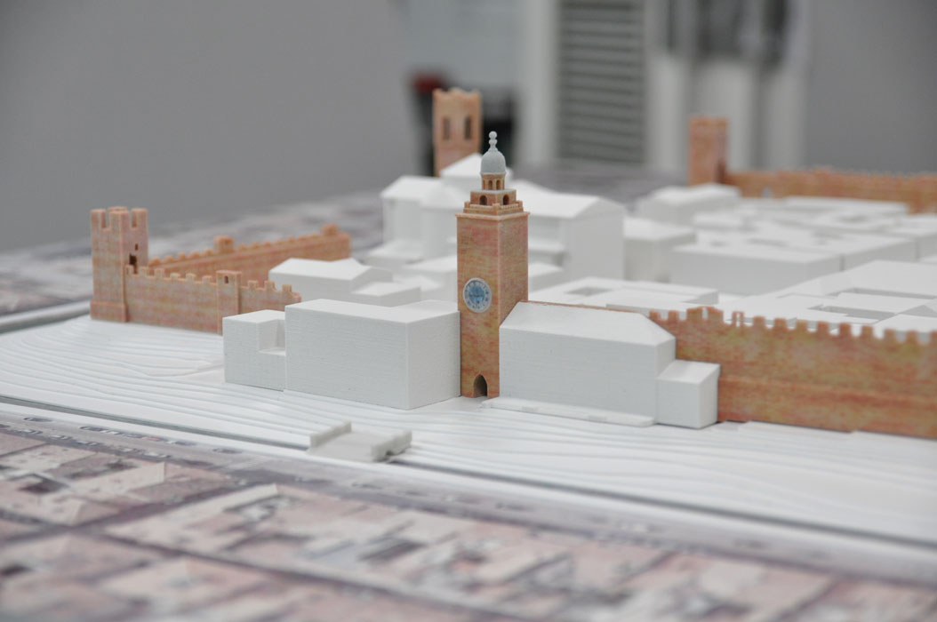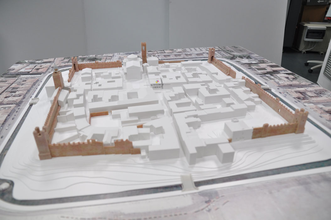 Il modello è stato realizzato unendo diverse tecnologie e competenze: stampa 3D tipo CJP a colori per l’ambito urbano delle mura attraverso moderazione e ricerca delle corrette cromie; stampa fotografica ad alta qualità ed intaglio del fotocopiano su pannello plastico; restituzione dell’andamento del terreno attraverso curve di livello con fogli di materiale plastico intagliati a controllo numerico; piedistallo con teca dedicata creato tramite stampa e lavorazione di specifici materiali ad alta resistenza e leggerezza.